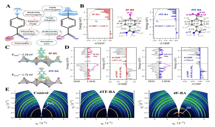 钙钛矿太阳电池中,界面钝化是提高其效率和稳定性的有效手段,各种钝化材料被广泛发现。其中,在三维(3D)钙钛矿吸收层表面制备二维(2D)钙钛矿薄膜,形成2D/3D异质结结构,从而有效钝化3D钙钛矿表面缺陷,提高载流子提取效率。但形成2D钙钛矿钝化层的机理尚缺少研究。鉴于此,深圳技术大学唐泽国副教授课题组联合南华大学王行柱教授课题组,通过对比研究结构相近的两种氟化盐,4-(三氟甲基)苯甲脒盐酸盐(4TF-BA-HCl)和4-氟苯甲脒盐酸盐(4F-BA-HCl),在构建3D/2D异质结中的差异。结果发现,4F-BA形成了高性能的3D/2D异质结,而4TF-BA则在钙钛矿表面形成了非晶层。理论及实验分析表明,分子内电荷平衡是形成2D钙钛矿的关键,4F-BA具有更平衡的分子内电荷分布,有利于形成有效的氢键,从而促进结晶性2D钙钛矿的形成。而4TF-BA由于其强吸电子基团CF₃而导致电荷分布不均,最终形成了非晶层。实验结果证明,2D钙钛矿较非晶层具有更好的钝化效果,从而导致更高的光电转换效率和稳定性。