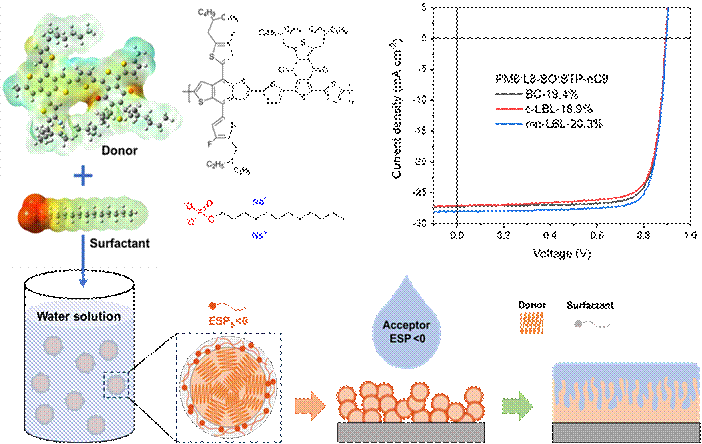 本研究中独创了一种突破性的水系加工策略,通过创新的逐层(LBL)制备方法成功克服了高效有机太阳能电池的厚度限制。通过工程化含有战略设计表面活性剂的水系纳米颗粒电子给体墨水,实现了对给体-受体相互扩散和垂直相分布的卓越控制。DFT计算表明,阴离子表面活性剂,特别是双电荷的SDP分子,为增强给体-受体相互作用创造了最佳的静电势梯度。EPR和UPS结果证实,阴离子表面活性剂同时实现了给体基质的p型掺杂和界面能量学的改善。形貌研究技术揭示,水基逐次沉积加工的厚膜活性层中垂直相分离的缓解和高结晶度的形成。优化的形貌导致厚膜OSC中有效的载流子分离和传输。采用含表面活性剂SDP的水系给体PM6和非卤化甲苯的受体L8-BO溶液处理的二元体系实现了接近20%的能量转换效率(PCE)。基于SDP加工的逐次沉积OSCs表现出最佳的厚度耐受性,在300400 nm厚度下分别实现了18.9%17.3%PCE。此外,将SDP逐次沉积策略应用于三元PM6:L8-BO:BTP-eC9系统获得了20.3%(认证效率19.9%)的出色PCE通过静电和掺杂效应的基础理解所展示的性能指标,为环境友好型OSC制造设立了新基准,同时为未来器件优化提供了通用平台。