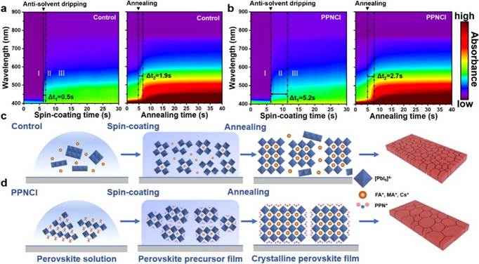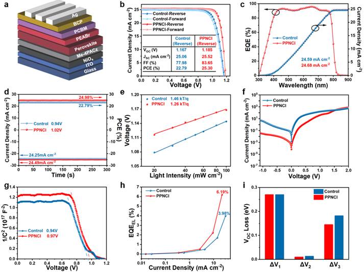 研究结果表明,将具有共振结构的离子添加剂PPNCl掺入钙钛矿前驱体溶液中对提高器件性能起着至关重要的作用。通过一系列表征和测试手段,研究团队发现,该离子添加剂能够有效的延缓钙钛矿的结晶过程,从而制备得到晶粒更大,缺陷密度更少的钙钛矿薄膜。除此之外,掺入PPNCl的钙钛矿太阳能电池表现出25.30%的冠军效率,并且在高温潮湿的测试条件下具有较好的器件稳定性。