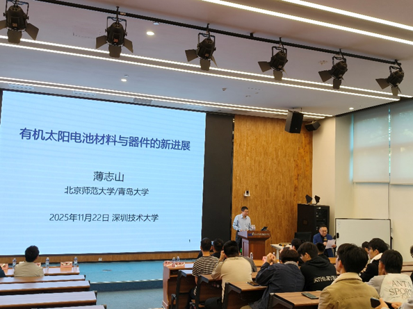 2025年11月22日,深圳技术大学“技大讲坛”第一百零二讲暨“新材料与新能源讲坛”第57讲在新材料与新能源学院B2-A101阶梯教室成功举办。本次讲座特邀北京师范大学/青岛大学薄志山教授,以“有机光伏材料与器件的新进展”为题,为我校师生带来了一场精彩的学术报告。